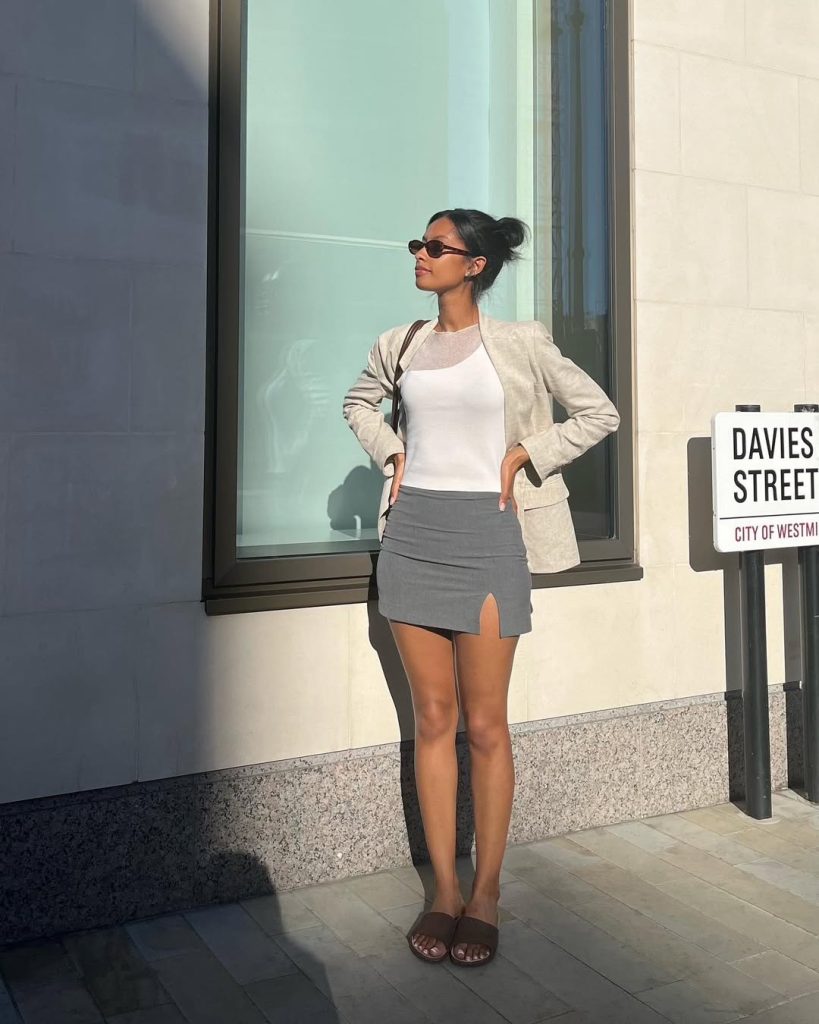 This look pushes the boundaries of summer office outfits in 2026, blending Elegant tailoring with a confident silhouette. Best suited for fashion-forward or less formal workplaces. For more conservative offices, swap the mini for a midi Skirt. The neutral palette keeps it grounded and wearable. Avoid overly high heels—flat sandals maintain balance. Perfect for city offices, meetings, or stylish workdays that transition into after-hours plans.