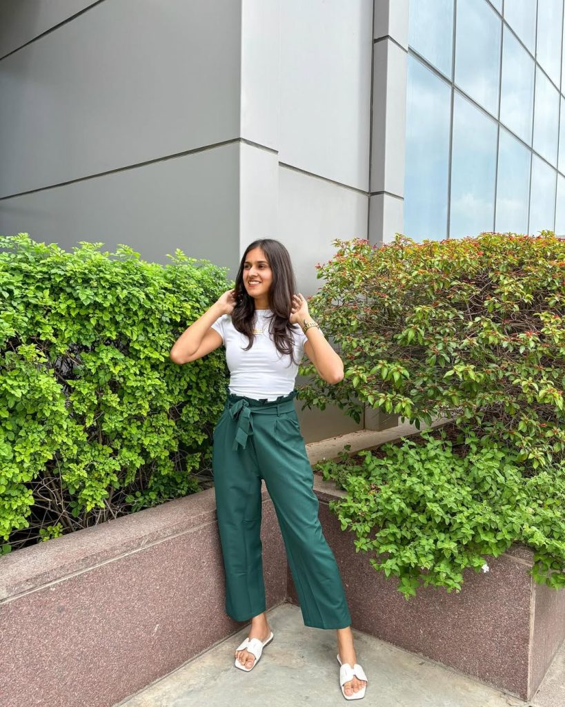 This outfit emphasizes ease and clarity, making it perfect for women’s casual office dressing in warmer months. The green tone adds freshness without overwhelming the look. This dress is great for petite women due to its cropped length and flattering for curvy women because of the defined waist. Add a blazer for a more Corporate feel. Avoid heavy layering—this look shines in simplicity. Ideal for everyday office wear or relaxed meetings.