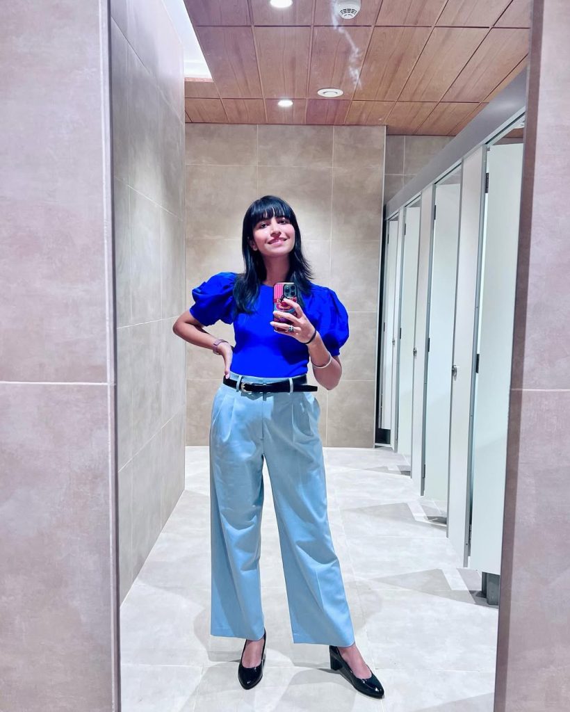 A bold blue top paired with soft trousers creates a vibrant yet professional outfit.