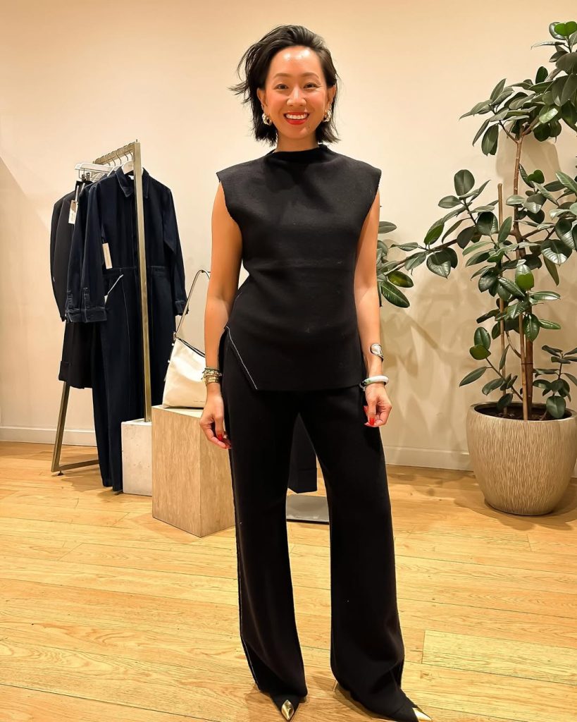 A structured sleeveless top and dark denim create a refined casual work outfit look with a subtle edge.