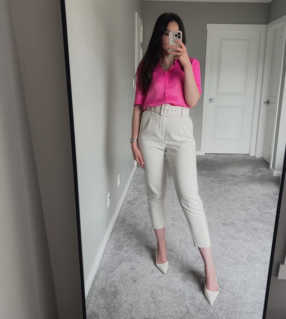 This look feels like a masterclass in chic, classy work dressing. The contrast is striking yet timeless, making it suitable for more Corporate environments or leadership roles. It’s also a wonderful option for petite women, as the high waist elongates the frame. For meetings, I would suggest adding a structured blazer, and for evening transitions, a bold lip. Avoid overly chunky accessories—they’d interrupt the clean lines. Think boardroom presentations or networking events.