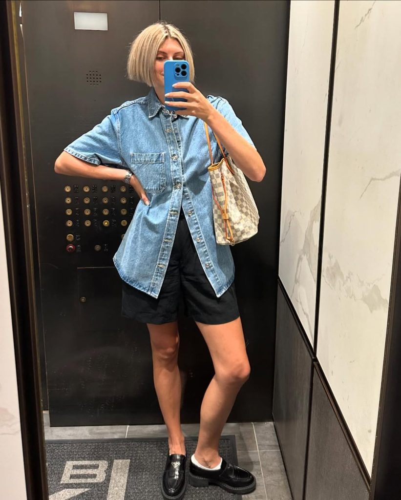 A relaxed denim shirt paired with tailored black shorts creates an effortless yet polished take on women’s casual office style.