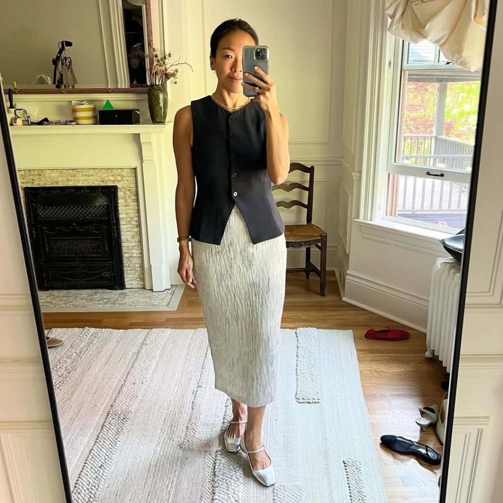 A structured black vest and a flowing Skirt create a refined silhouette that feels both Elegant and effortlessly modern.
