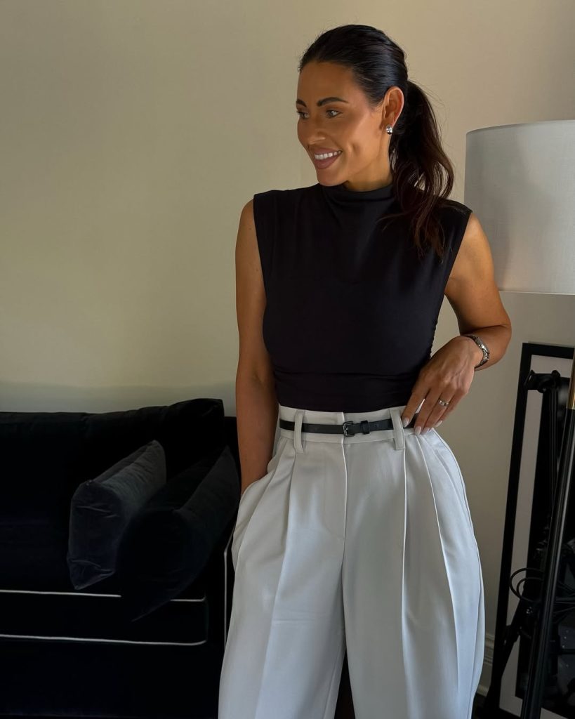 A fitted black top with high-waisted trousers delivers a sharp, Elegant silhouette that is ideal for refined office settings.