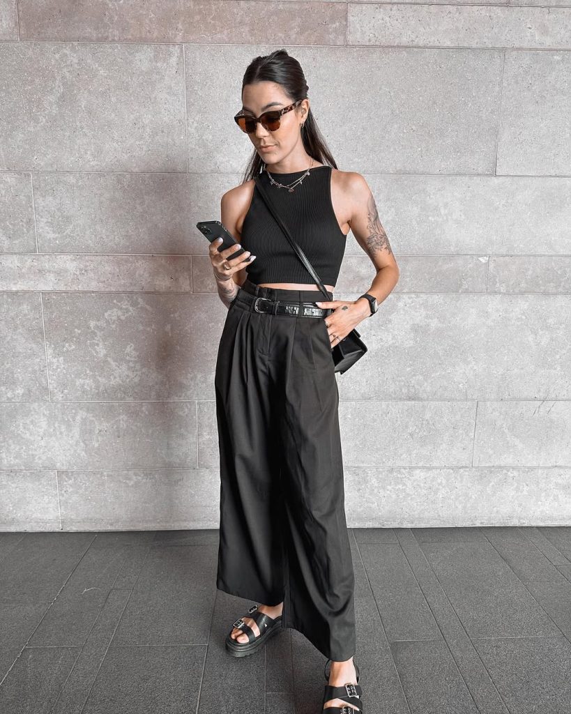 This outfit leans into work-chic, smart-casual territory, perfect for creative offices or tech environments. The cropped top adds a modern twist while the trousers keep it grounded in professional polish. For women who are curvy or midsize, the high waist creates a flattering structure. Add a lightweight blazer if needed, but avoid bulky layers. Ideal for fast-paced days when you’re moving between meetings and errands in hot weather.