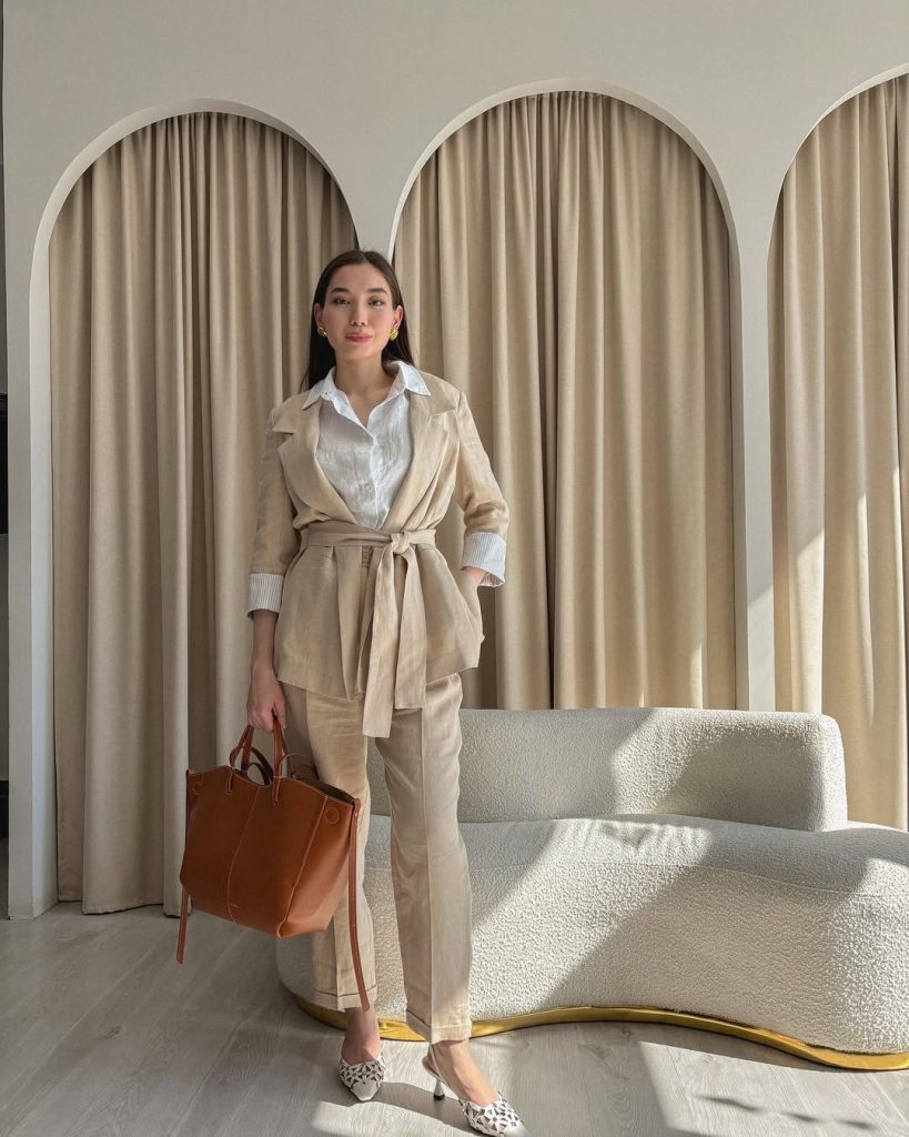 A soft linen set delivers breathable elegance, making it perfect for corporate summer dressing.