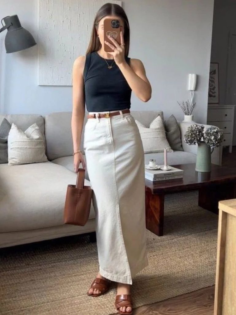 A clean tank and long skirt pairing creates a Modest yet modern Aesthetic office outfit.