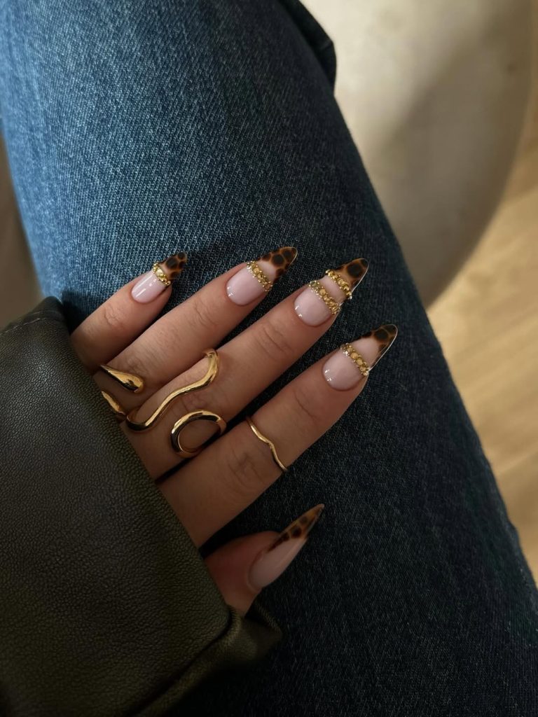 This design is pure art—a mix of tortoise amber tones and sculptural gold elements that catch the light beautifully. Each nail looks like a miniature jewelry piece, perfectly blending organic shapes with high-fashion edge. It’s bold, creative, and ideal for those who treat their manicure as a form of self-expression. The tortoise pattern contrasts elegantly with metallic gold, giving a rich, designer-inspired finish.