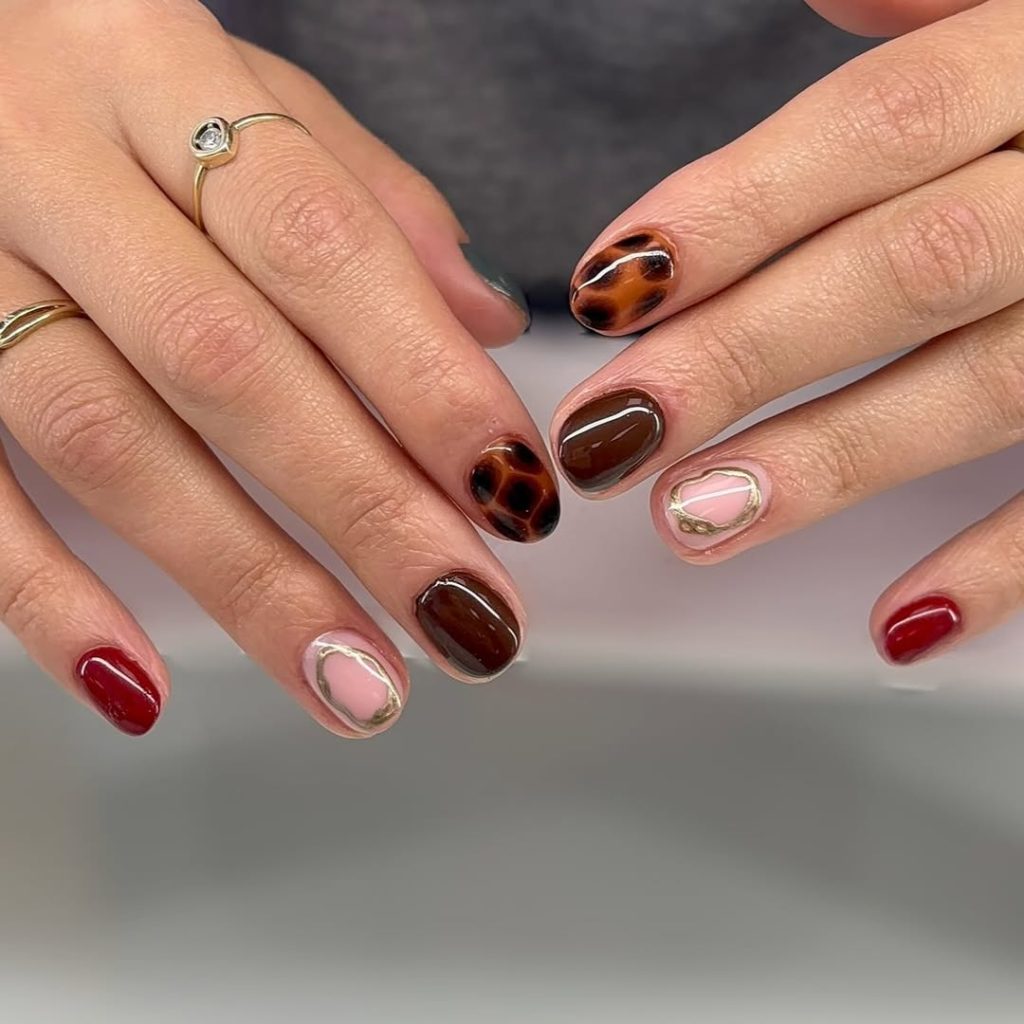 This chic mix of tortoise, nude, and espresso brown nails is effortlessly stylish. The combination feels modern yet grounded, with each nail offering a slightly different finish—glossy, artistic, and full of personality. It’s the kind of design that pairs beautifully with cozy knits or structured blazers, making it a year-round favorite.