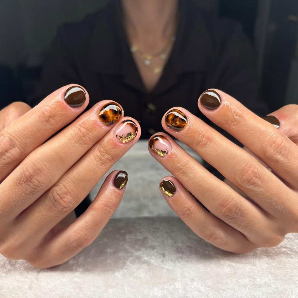 These short tortoise nails are pure design inspo—featuring soft pink bases and brown art highlighted with delicate touches of gold. The metallic flakes add a subtle glow that makes the look both modern and refined. It’s that perfect balance between minimalism and luxury, turning even the shortest nails into mini works of art.