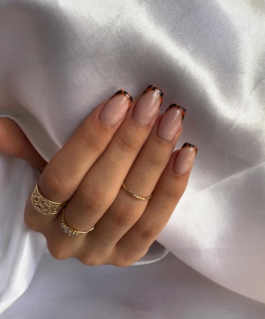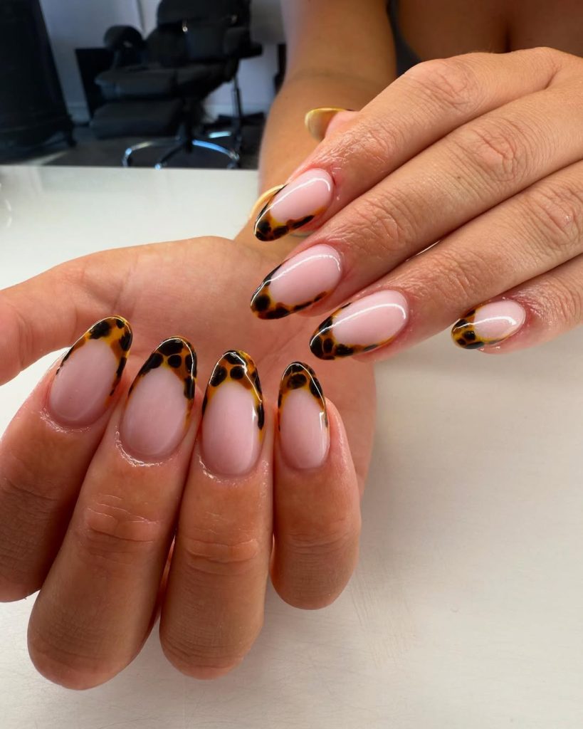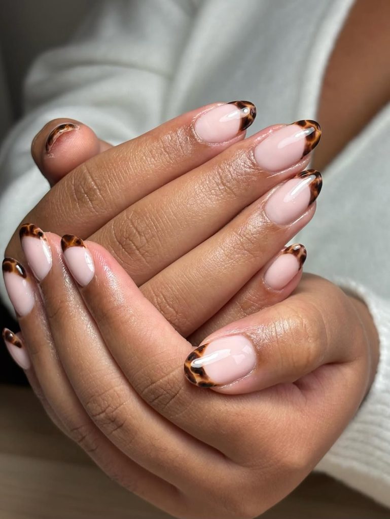 Perfect for almond or oval shapes, this French design complements medium to short nails. It pairs beautifully with warm tones like beige, tan, or gold. The tortoise tips are easy to maintain and look equally chic on natural or gel extensions—timeless yet on trend for 2026.