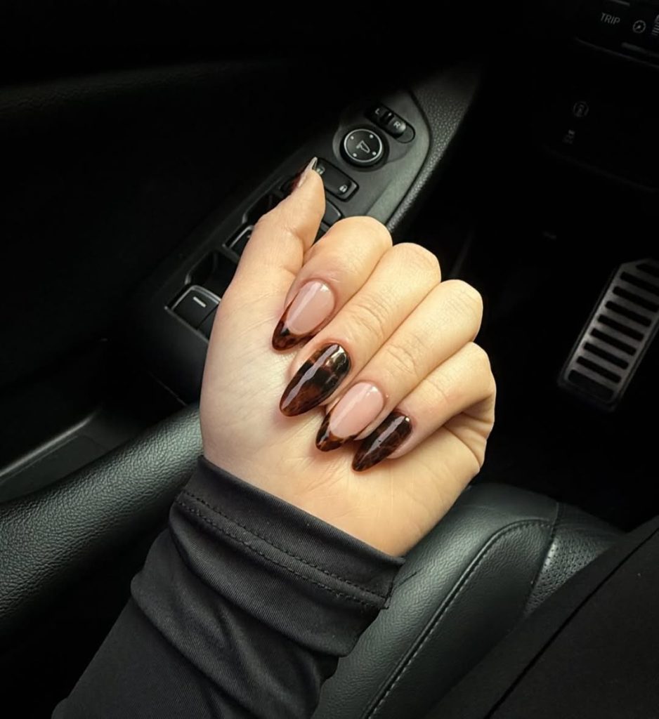 Best suited for oval or short almond nails, this look offers versatility and balance. The nude and brown shades complement every skin tone, and the tortoise pattern adds depth without overwhelming the hand. A quick polish refresh every week will keep the glossy art look picture-perfect.
