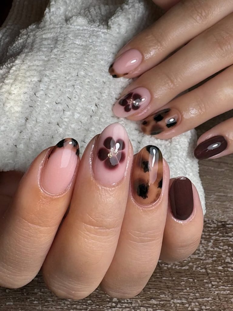 This manicure combines the warmth of tortoise patterns with delicate floral art, creating a dreamy and feminine design. Each nail tells a small story—a blend of earthy tones, sheer pinks, and chocolate details anchored by a single bloom. The floral element adds a touch of softness, turning this tortoise look into something romantic and artful, perfect for those who love subtle design.