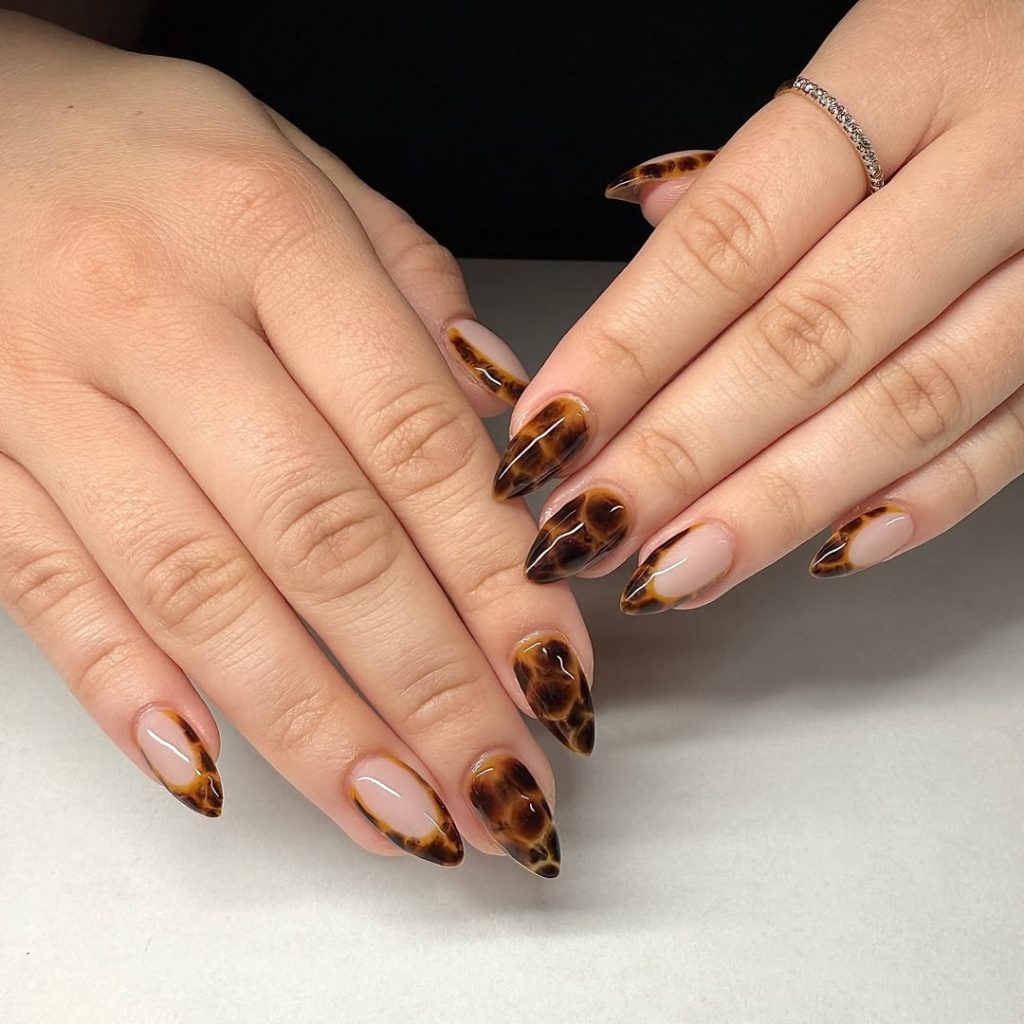 Rich amber tones and glossy finishes make these tortoise nails feel almost jewel-like. Each almond nail glows with depth and texture, giving the illusion of glass. This look draws inspiration from nature—earthy, elegant, and timeless. It’s the kind of manicure that pairs beautifully with cozy knits in winter or light linen in summer.