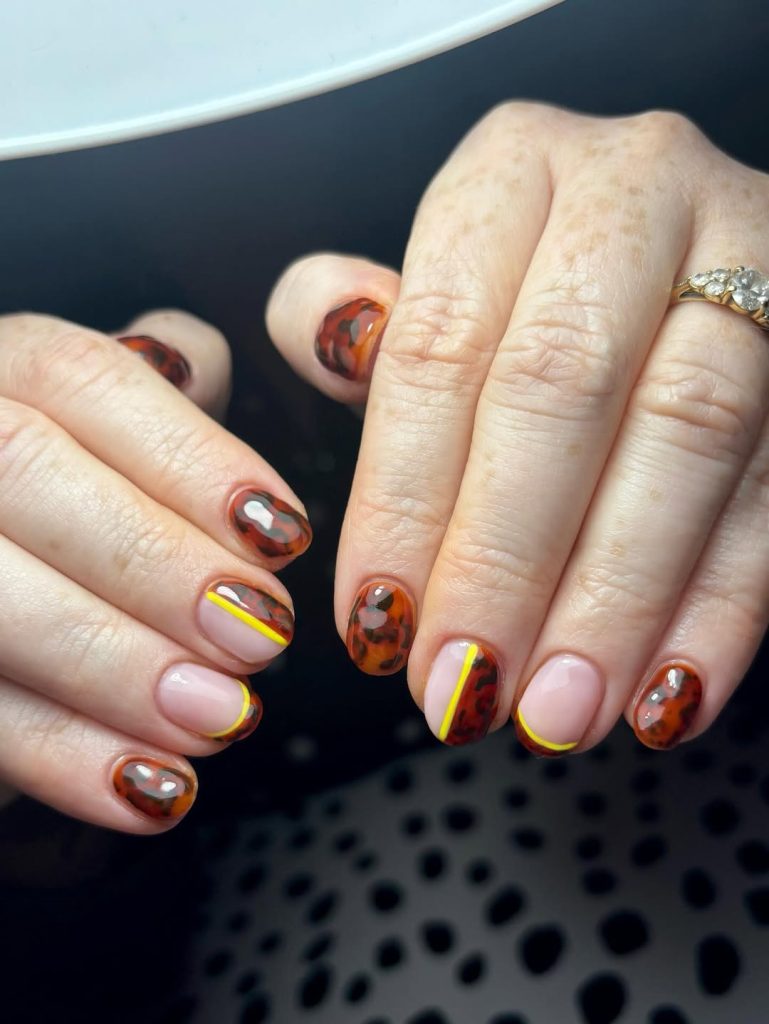 These short tortoise nails bring a fun, creative twist to a classic design. The mix of tortoise art and fine yellow accents feels unexpected—like adding a pop of sunshine to your everyday routine. It’s fresh, stylish, and unapologetically modern while keeping the rich maroon and brown tones of the traditional pattern. Perfect for anyone who loves color but still wants a sophisticated vibe.