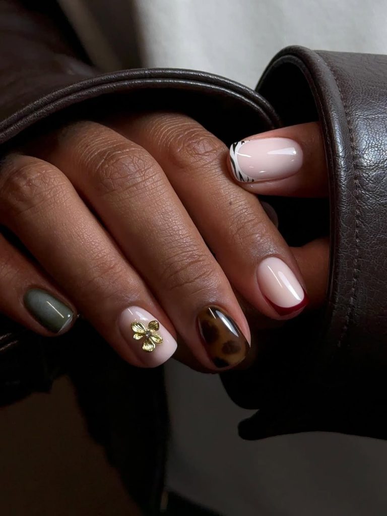 This playful mix-and-match manicure brings together soft neutrals, dark green, and a single tortoise accent nail—a stylish nod to design freedom. Each nail tells its own story, from a dainty gold flower to French lines and moody tones. It’s a small masterpiece for your hands, proving that you can blend elegance and creativity in one look.