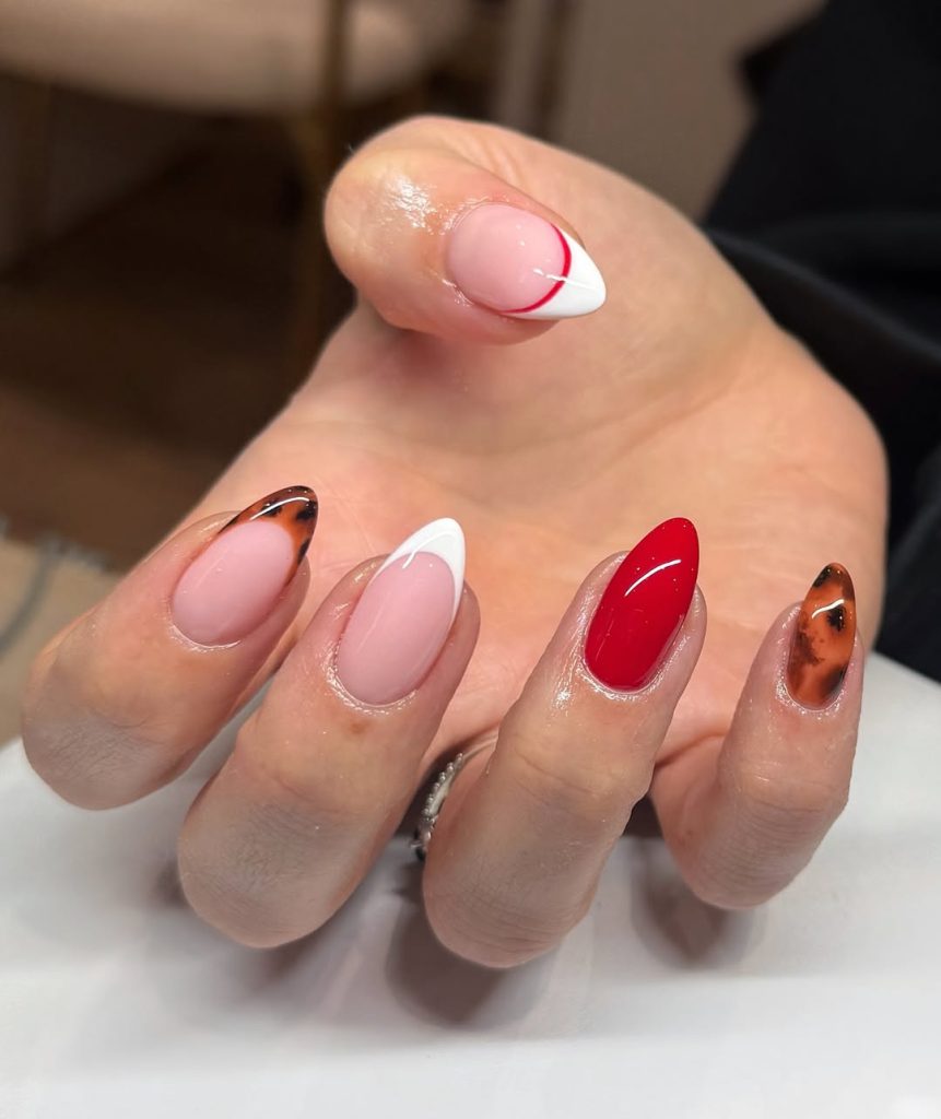 This is a real design inspiration moment—this one pairs tortoise art with red and white French accent nails. This combination is simple but original and is truly reflective of 2026 modern trends. The tortoise nails are the warm, classic components, while the red energizes the design. This is a brave, fashionable and stands out combination.