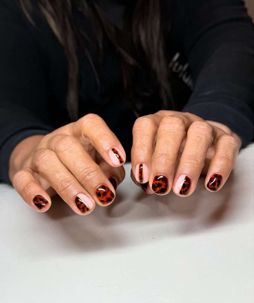 The classic tortoise design with short rounded nails and a modern touch is what you see here. The high-shine finish creates a luxurious feel. The rich caramel and chocolate hues are always beautiful and are chic under any lighting. This design exudes confidence while offering a practical and fashionable statement, creating a perfect balance.