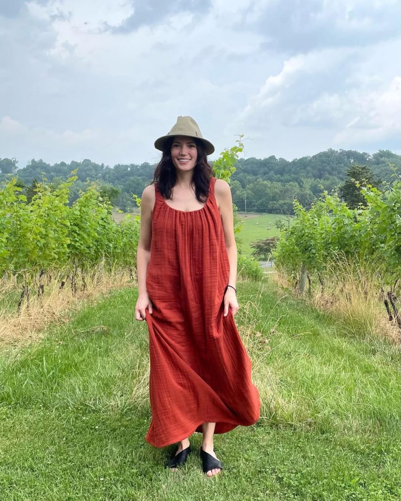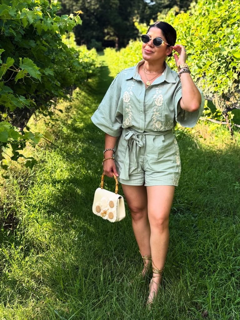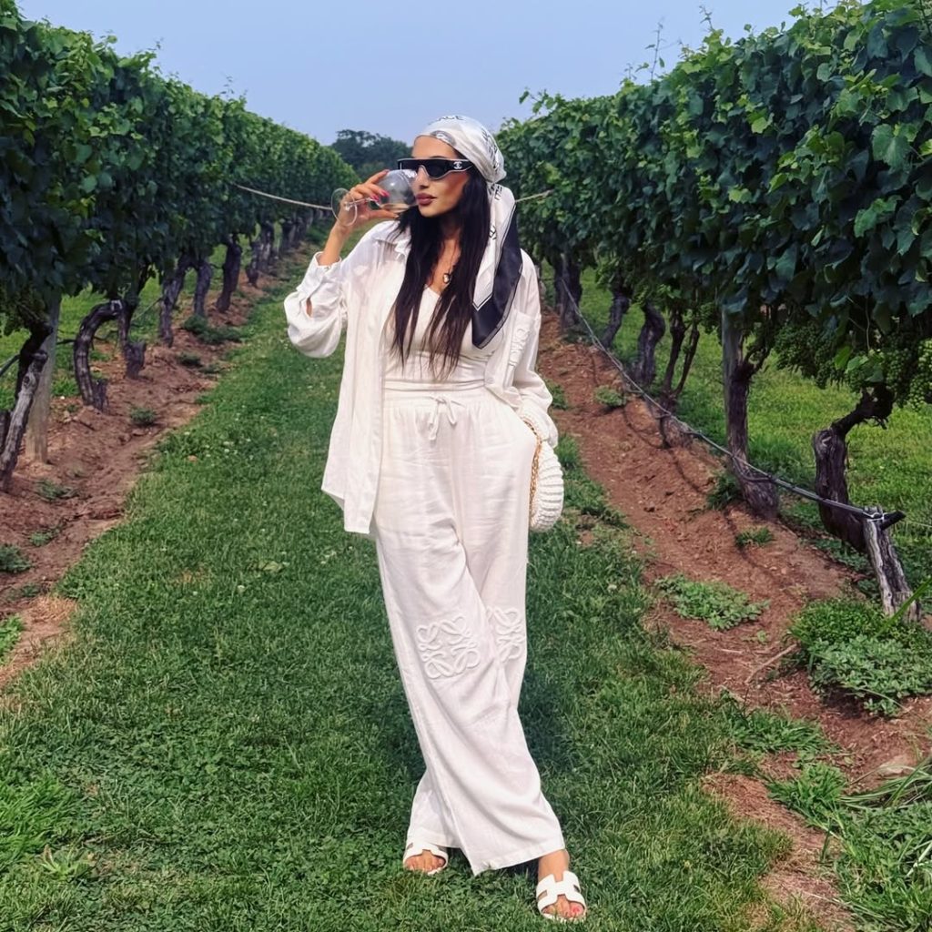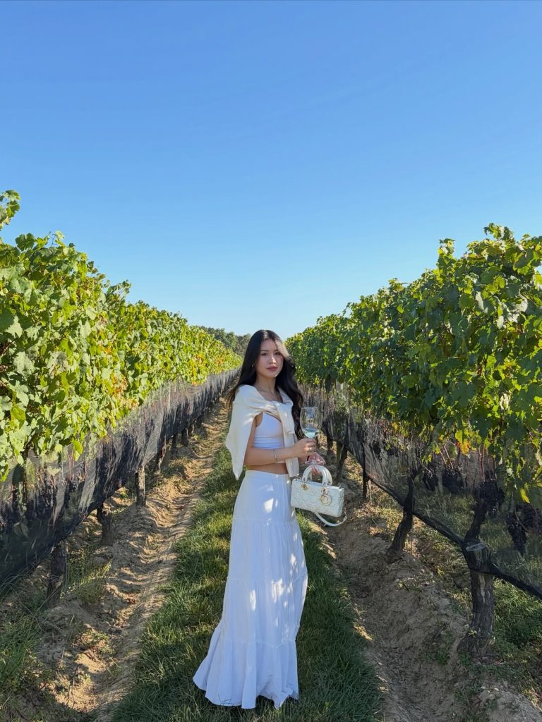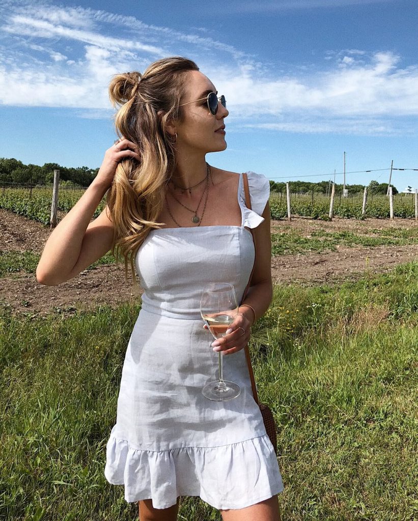 A crisp white linen dress with subtle ruffles feels timeless and fresh, capturing that breezy spring mood wineries do so well. Light, feminine, and undeniably chic, it’s made for slow afternoons and golden-hour pours.