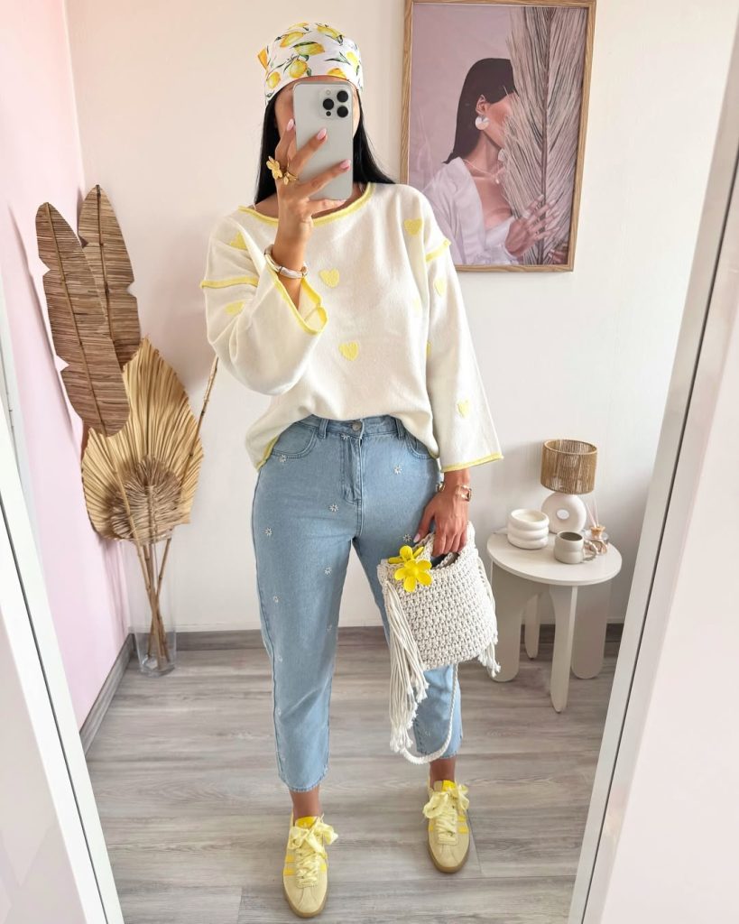 Fresh, youthful, and relaxed, this outfit modernizes wine-tasting jeans with cheerful color accents and an artistic touch.