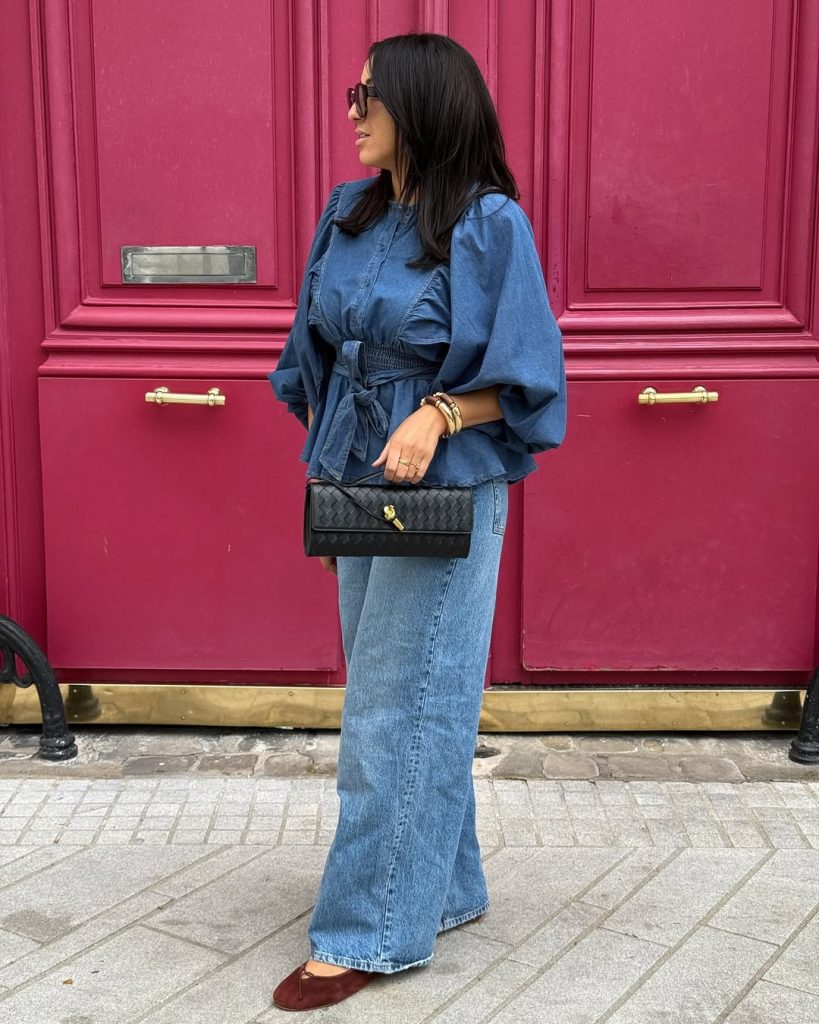 A modern take on denim dressing, this outfit proves that wide-leg jeans can feel elevated, sculptural, and quietly powerful.