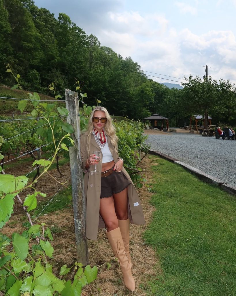 This outfit is ideal for cold spring outfits in 2026, especially when mornings start crisp but afternoons warm up. The trench adds polish, while the shorts keep it modern and confident. This outfit is perfect for early tastings or winery walks, where layering is crucial. Avoid bulky bags—a sleek clutch or crossbody keeps the silhouette sharp.