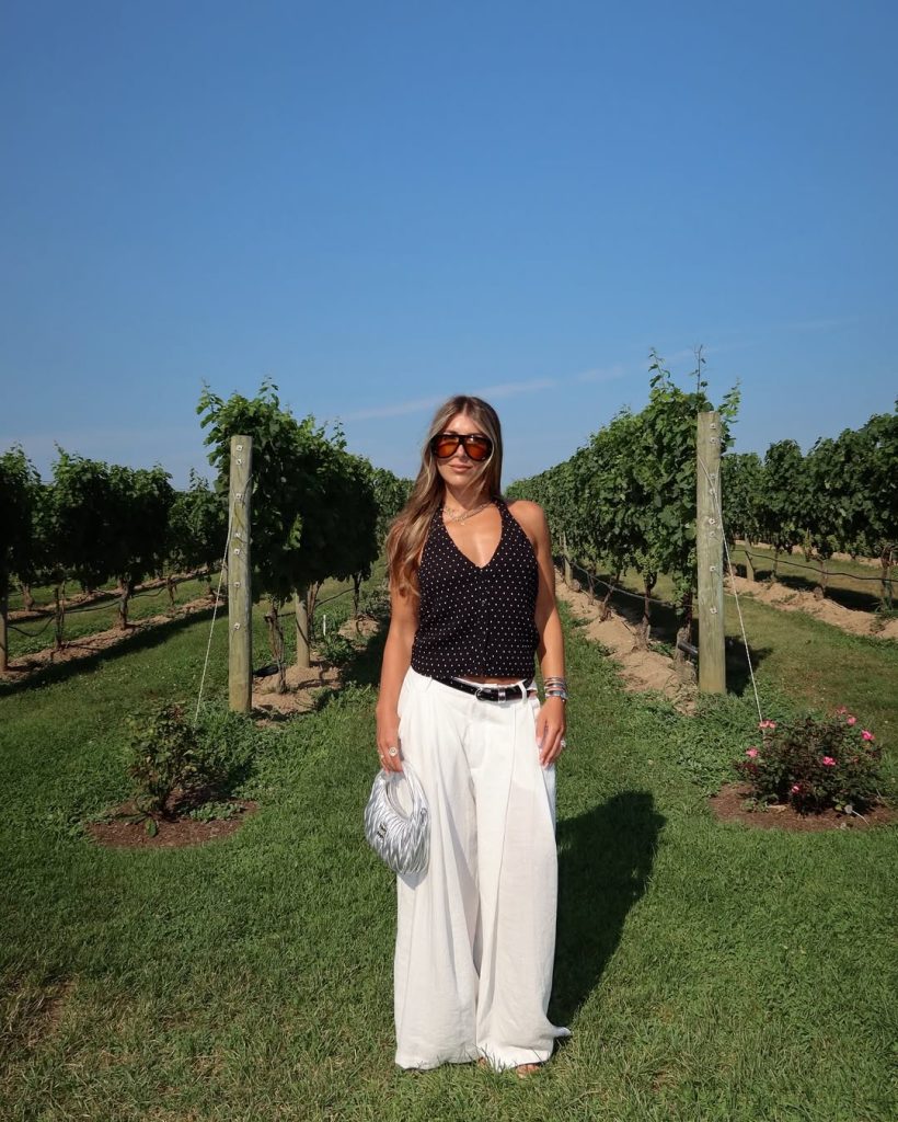 This is a strong option for late-morning tastings when temperatures fluctuate. The sleeveless top works thanks to movement and sun exposure, while the trousers ground the look for cooler air. If it gets colder, a cropped jacket layers seamlessly without disrupting proportions.
