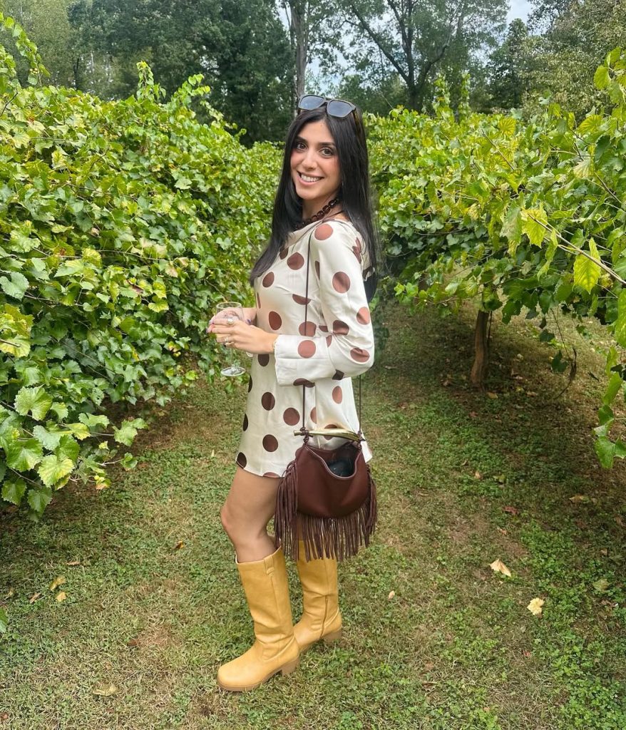 A dotted mini paired with tall boots channels Western charm while staying lighthearted enough for a casual spring wine-tasting afternoon.