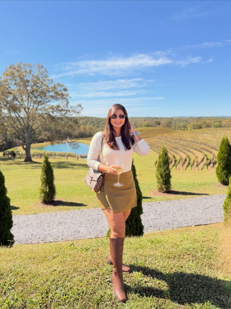 A fitted top and wrap-style skirt offer chic vineyard polish that works for tastings stretching from midday into golden hour.
