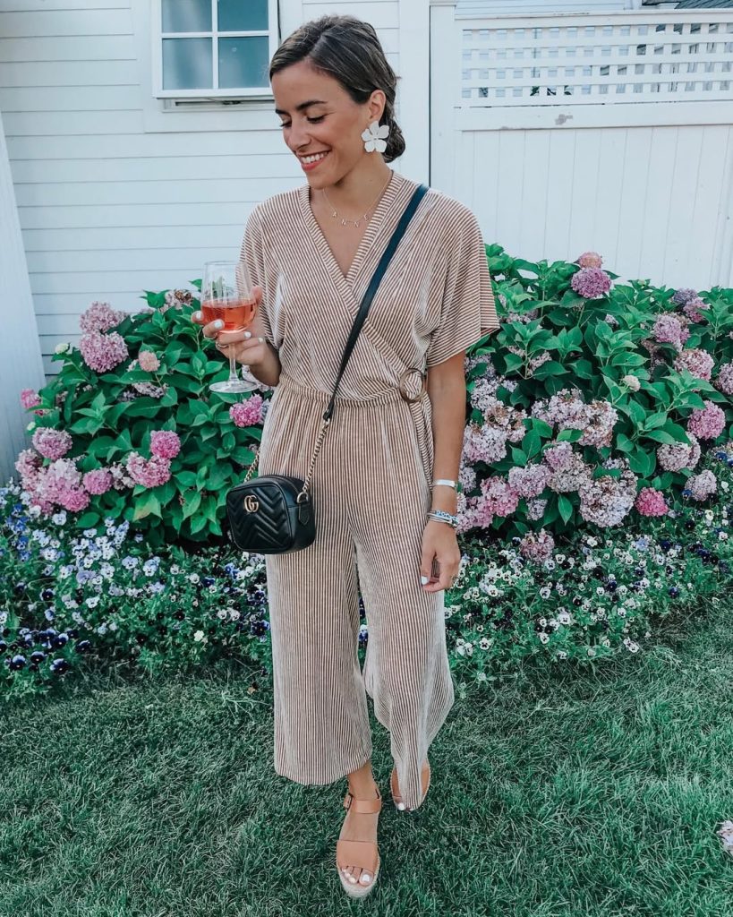 Perfect for informal tastings or a wine-tasting jeans moment with friends. Add stacked bracelets for personality. Avoid overly distressed shorts—they can feel out of place in more polished tasting rooms. A striped wrap jumpsuit is a great, cute option for sunny spring weekends.