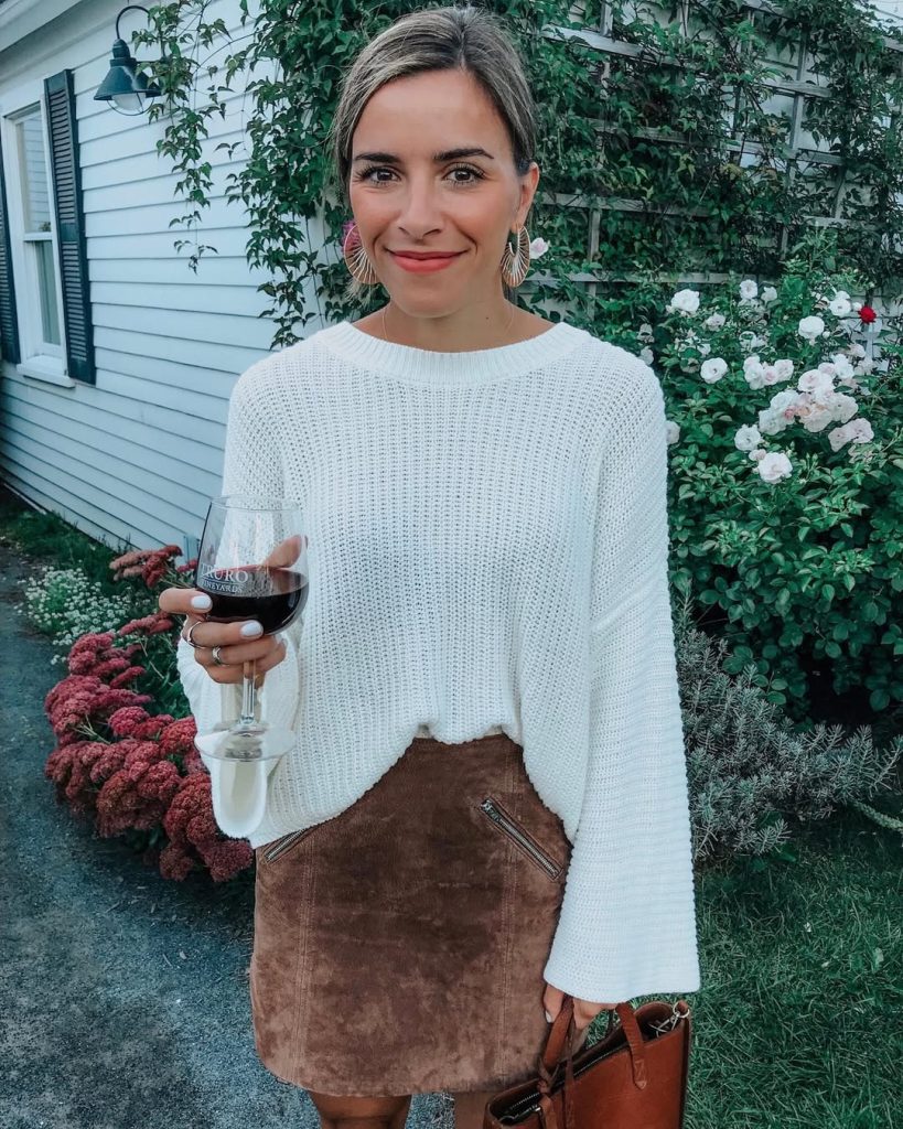 When spring leans cool, a chunky knit paired with a suede skirt feels seasonally perfect. Warm, textural, and softly feminine, this look embraces a cold evening among the vines.