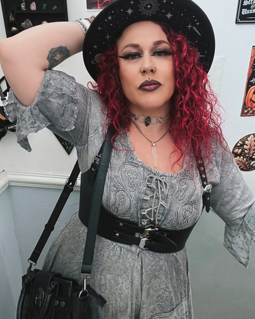 This look brings a softer take on witchy style with its pale grey fabric, delicate embroidery, and flowing sleeves. The mix of textures feels both modern and vintage, creating a whimsical aesthetic that stands out without relying on deep dark tones. Her curly red hair adds a bold contrast, giving the whole look a playful, cute twist that still fits the gothic spirit.