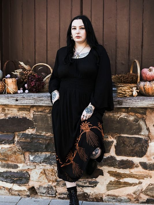 This outfit works beautifully for women who want something witchy but a bit more subtle. The light fabric and lace-up bodice flatter many shapes, especially plus-size figures, and offer all-day comfort. The vibe is gentle and feminine, making it perfect for spring or fall. What makes it unique is how approachable it feels—witchy fashion with a softer, more bohemian edge.