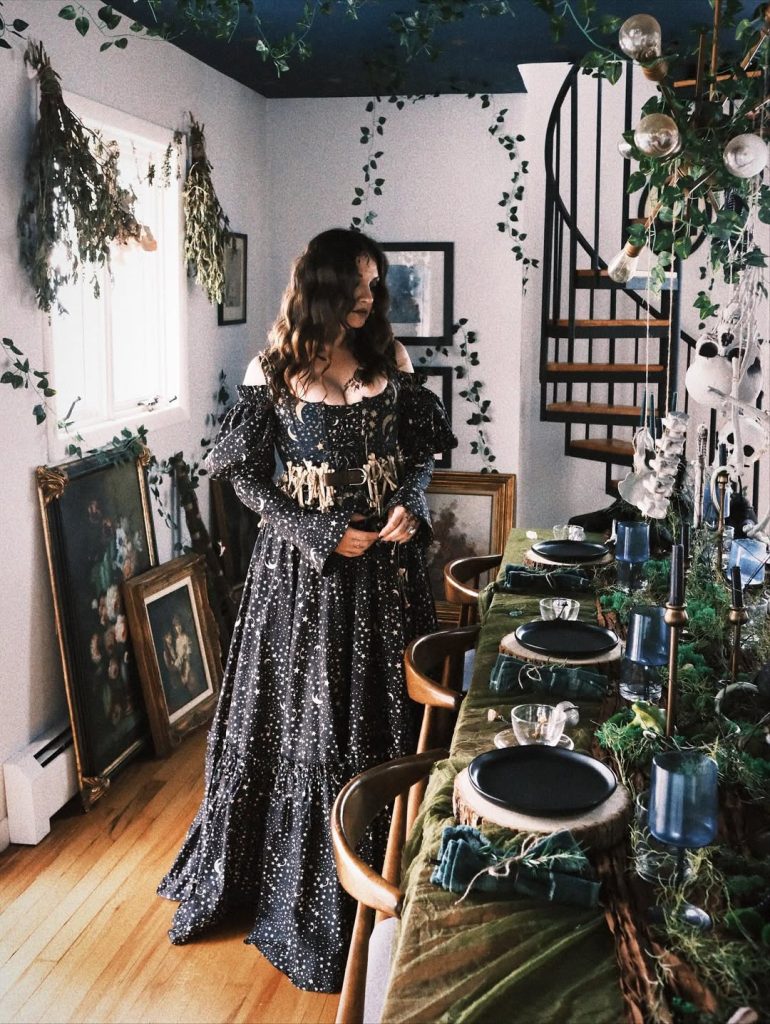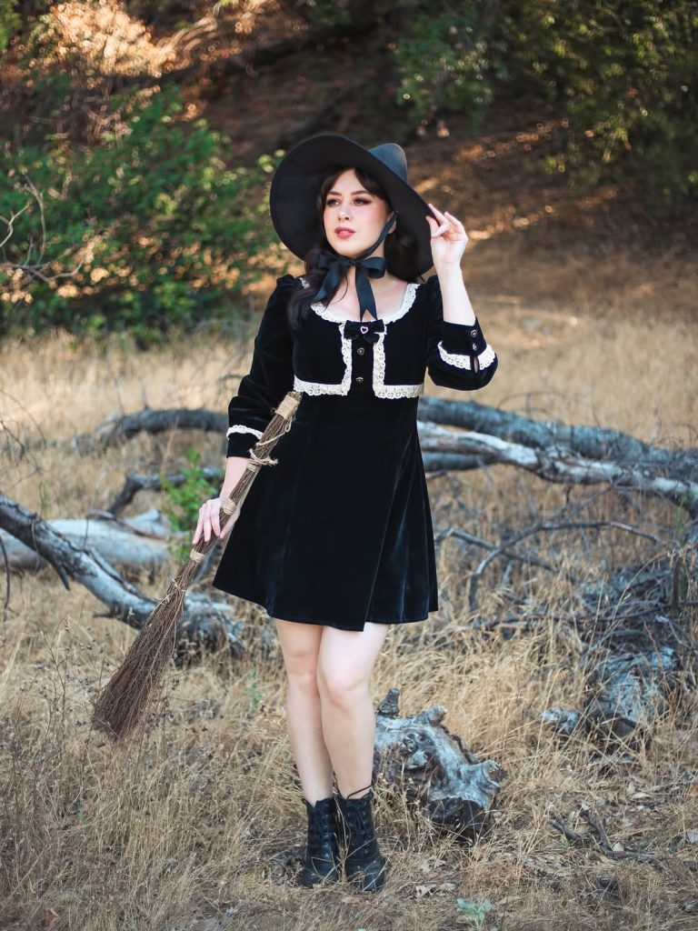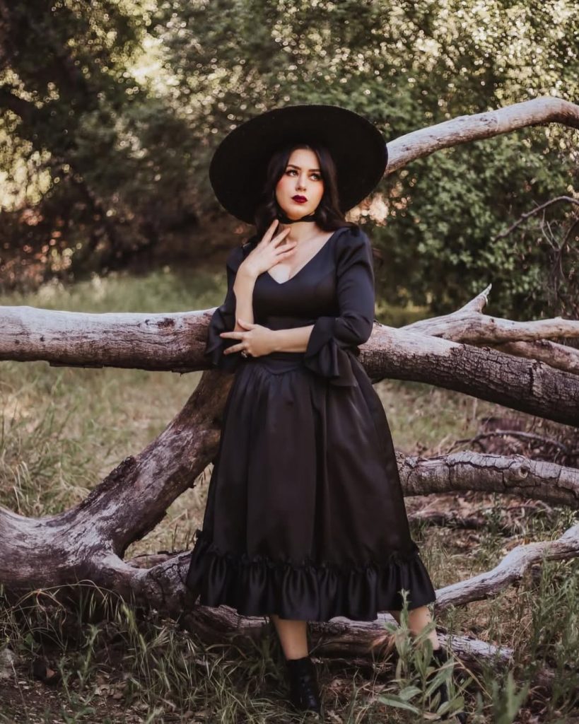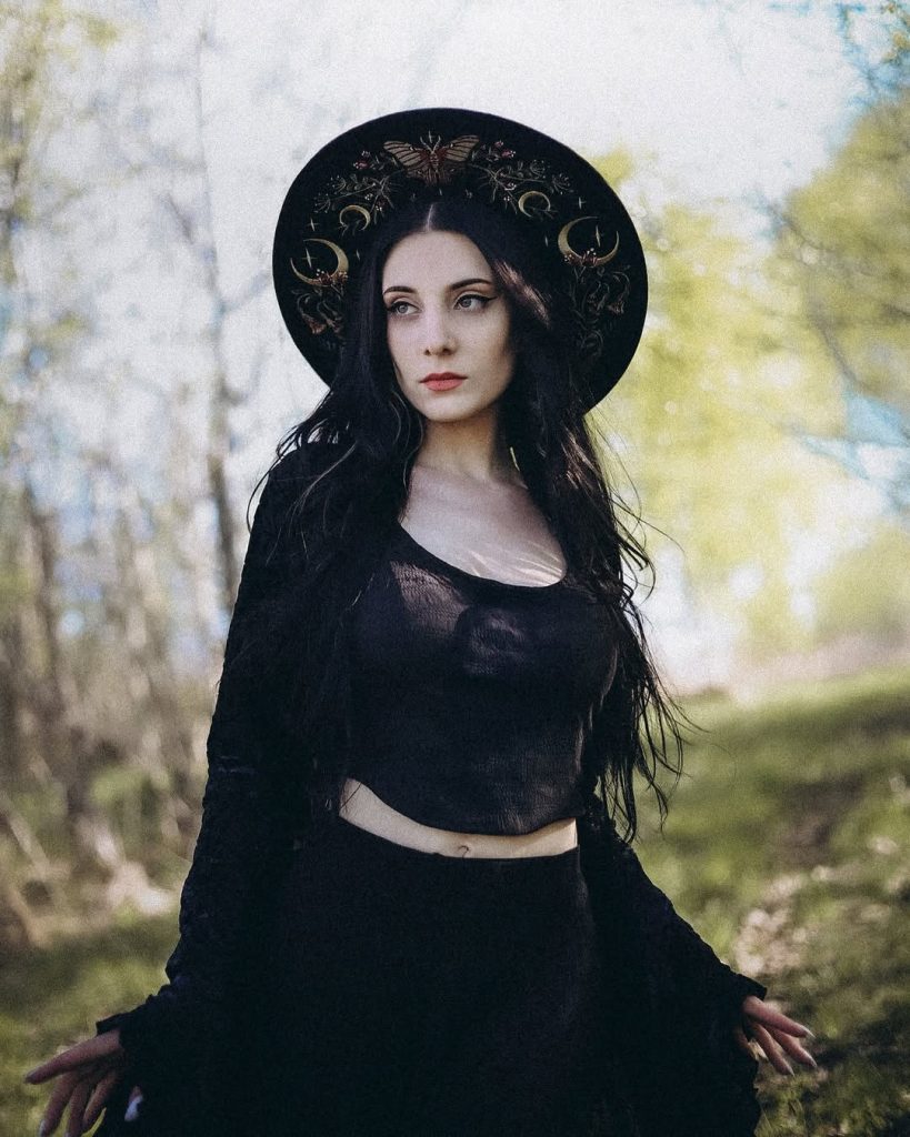 This look brings a charming 70s and bohemian flair into the witchy aesthetic, with its soft velvet dress and delicate white trim. The wide-brim hat creates a dreamy silhouette that feels both whimsical and grounded in old-world inspo. There’s a sweet, almost cute energy here, especially with the gentle pose and natural woodland setting—it feels like a modern fairytale moment with just the right touch of dark romance.