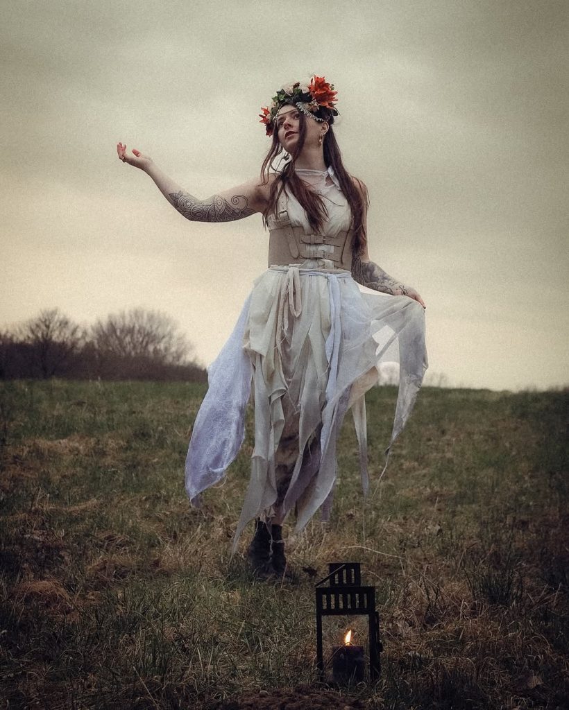 This outfit feels like a soft, otherworldly vision—light, airy layers in shades of white that move beautifully with every step. The floral crown adds a whimsical touch, bringing in soft boho inspo, while the corset-style top grounds the look with a subtle gothic edge. It’s dreamy, delicate, and full of enchanting energy, like a spring ritual brought to life.