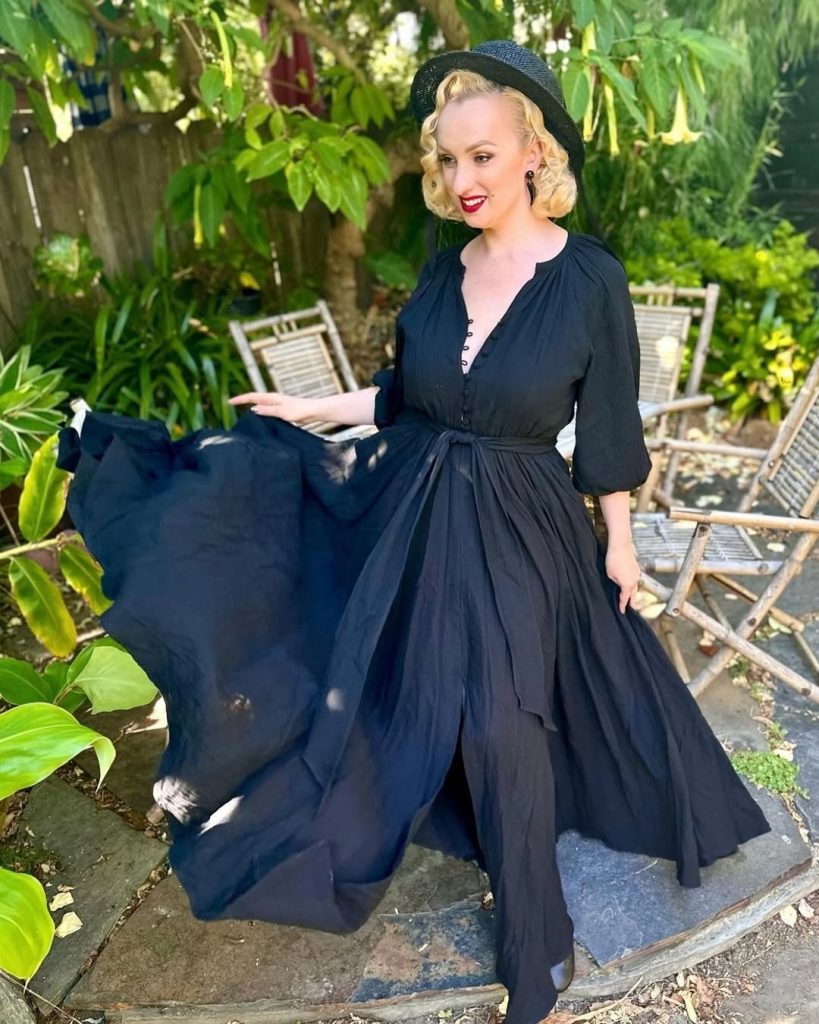 This outfit carries a joyful, theatrical energy—light, romantic, and full of movement. The soft black fabric flows beautifully as she twirls, and the contrast with her golden curls adds a sweet vintage charm. It’s whimsical and cute with that unmistakable boho touch, bringing just enough dark mood to feel witchy without sacrificing brightness or playfulness.