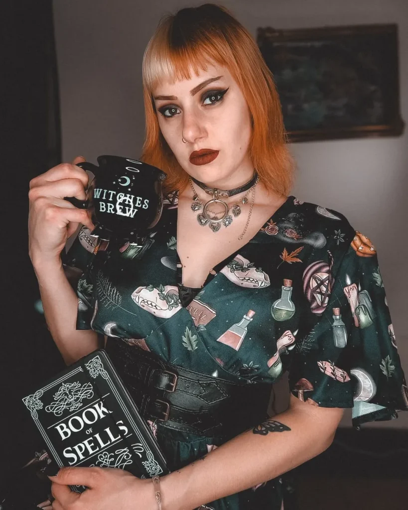 This fun and quirky look leans into witchiness with personality and charm. The potion-themed print brings a cute whimsical vibe, while the bold eyeliner and warm hair color add a modern goth twist. There’s a casual comfort here mixed with playful autumn inspo—like someone who effortlessly blends daily life with a touch of magic.