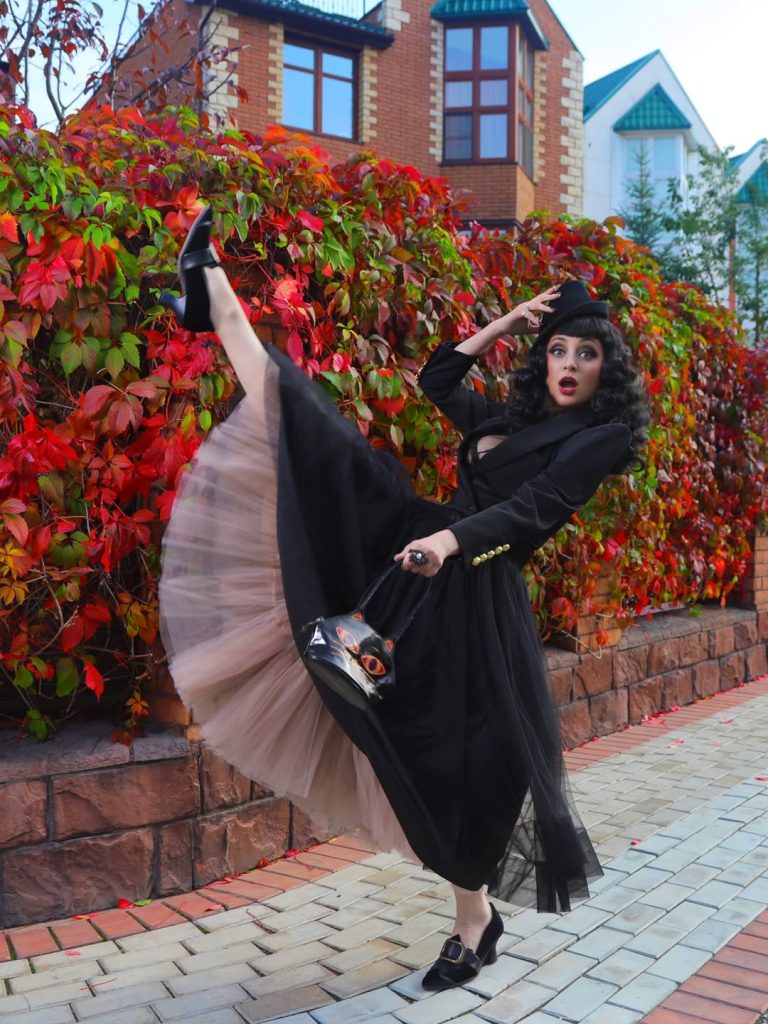 This look radiates personality—bold movement, theatrical flair, and a delightful mix of cute and dark aesthetics. The layered tulle adds a whimsical softness that contrasts beautifully with the tailored black jacket, creating a playful yet elegant silhouette. It’s full of joyful autumn energy with just the right dash of gothic attitude.