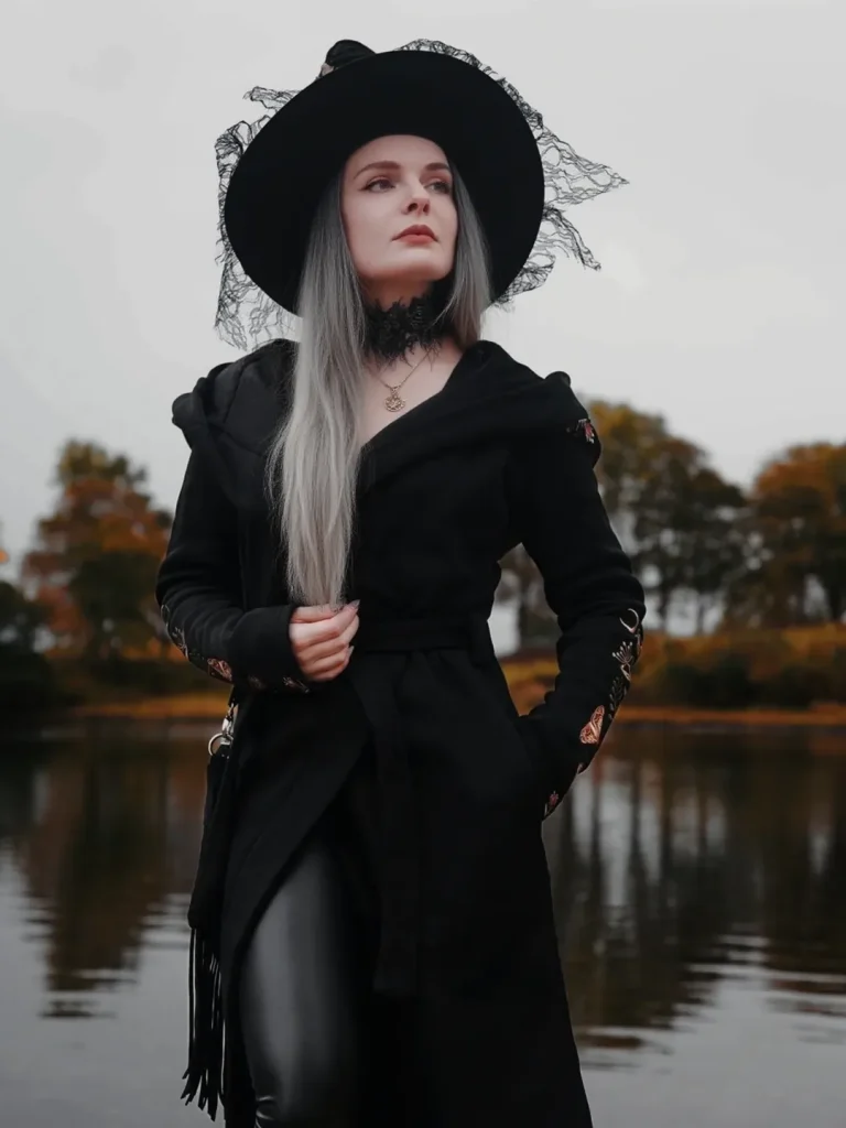This style flatters women who love clean shapes with a dose of drama. The long coat creates a polished silhouette, and the lace edging adds softness without losing the dark aesthetic. It’s ideal for colder seasons, especially fall and winter, when you want something warm, comfy, and effortlessly witchy. The overall vibe is serene, confident, and timeless.