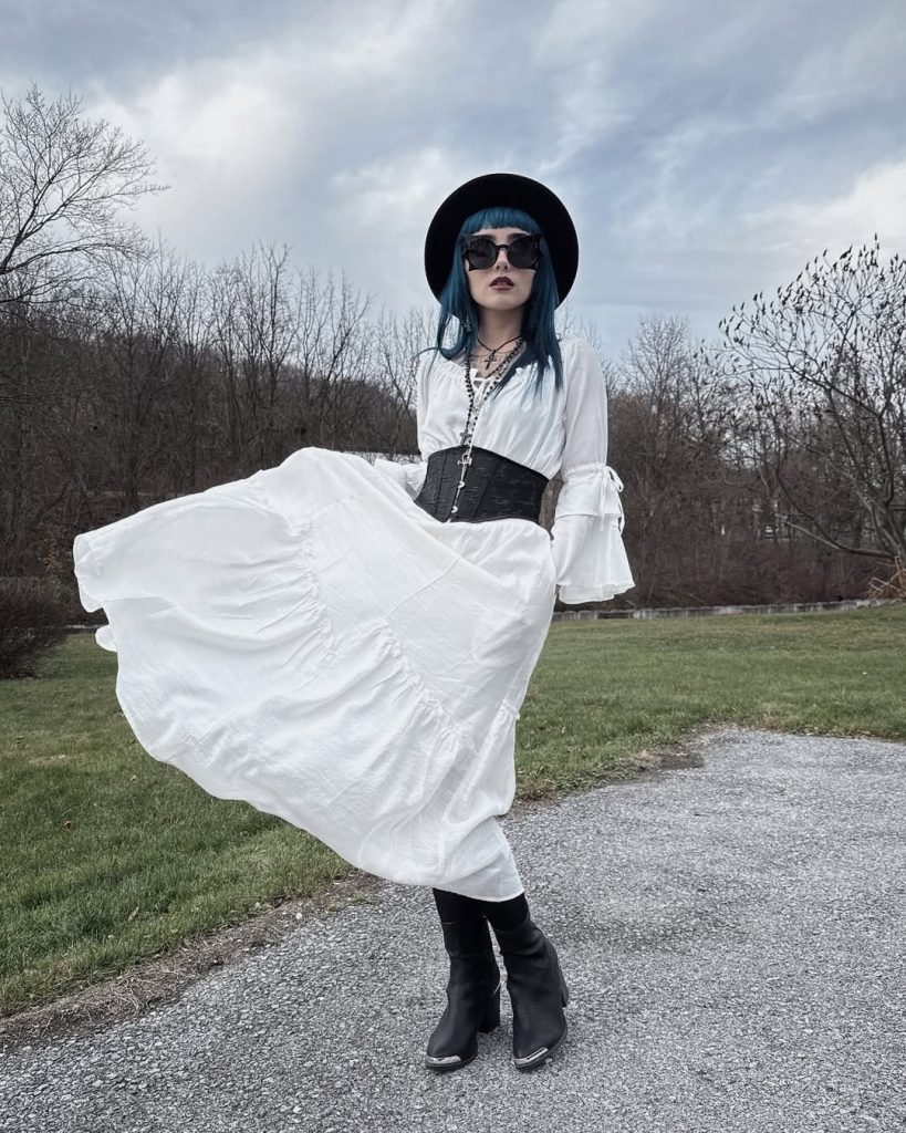 This look blends purity and mystery in the most striking way. The flowing white dress catches the wind beautifully, giving the whole outfit a soft, whimsical glow against the muted landscape. Paired with deep blue hair, a wide black hat, and bold sunglasses, the aesthetic becomes a modern twist on classic witchy inspo—light, airy, but still grounded in that dark, enchanting energy.