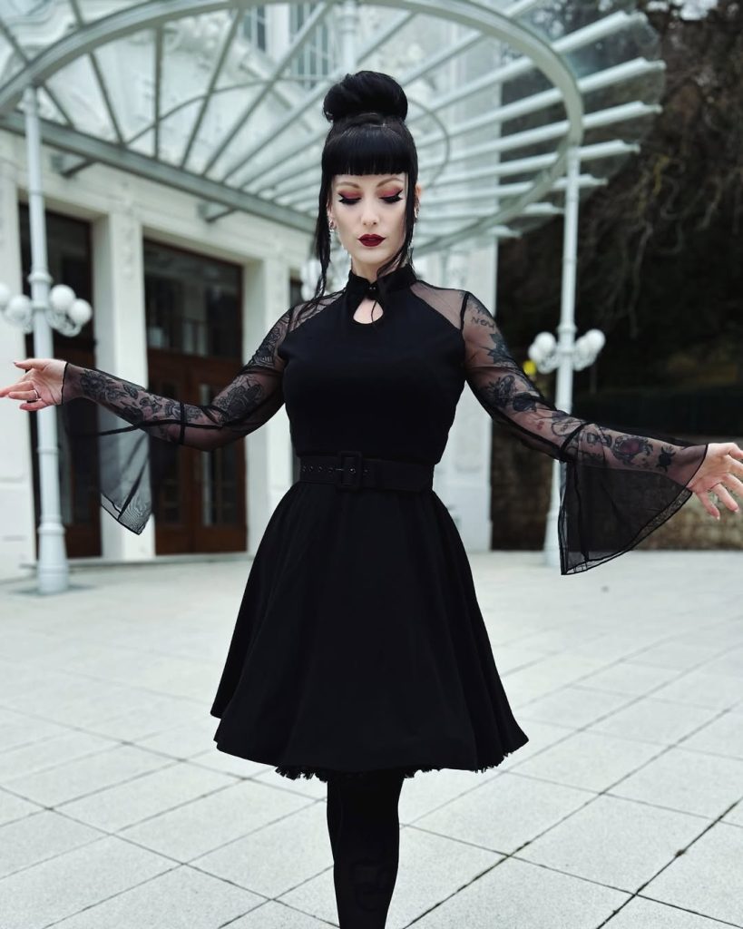 This outfit feels like a perfect blend of modern goth and classic elegance. The high bun, the subtle keyhole neckline, and the sheer patterned sleeves all bring an elevated aesthetic that still whispers dark mystery. There’s a strong, confident vibe—a bit theatrical, a bit sophisticated—like a witch who knows exactly what she wants and doesn’t mind turning heads along the way.