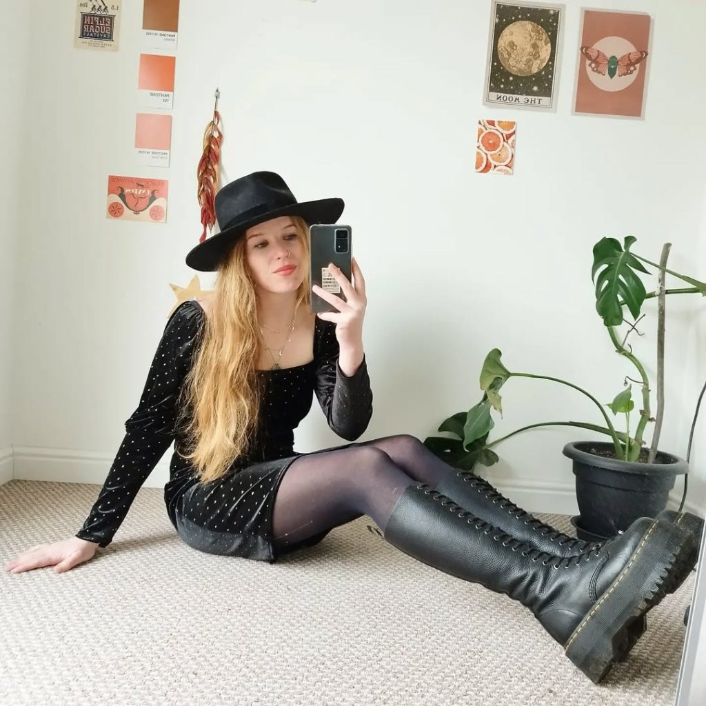 Here, the witchy vibe leans into something more casual and cute, with a star-speckled velvet dress that adds just a hint of sparkle. The oversized hat keeps the dark aesthetic alive, while the tall boots bring a grounded, comfy strength to the outfit. It has a sweet boho energy mixed with gothic undertones—perfect for a quiet autumn afternoon or a cozy winter moment indoors.