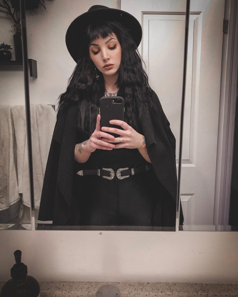 This look feels like a modern goth dream—mysterious, chic, and effortlessly stylish. The textured black hair, the cape-style top, and the classic hat create a powerful silhouette that carries hints of 90s inspo and aesthetic minimalism. It’s dark, sleek, and quietly dramatic without trying too hard, giving the kind of energy that makes you feel grounded and magnetic at the same time.