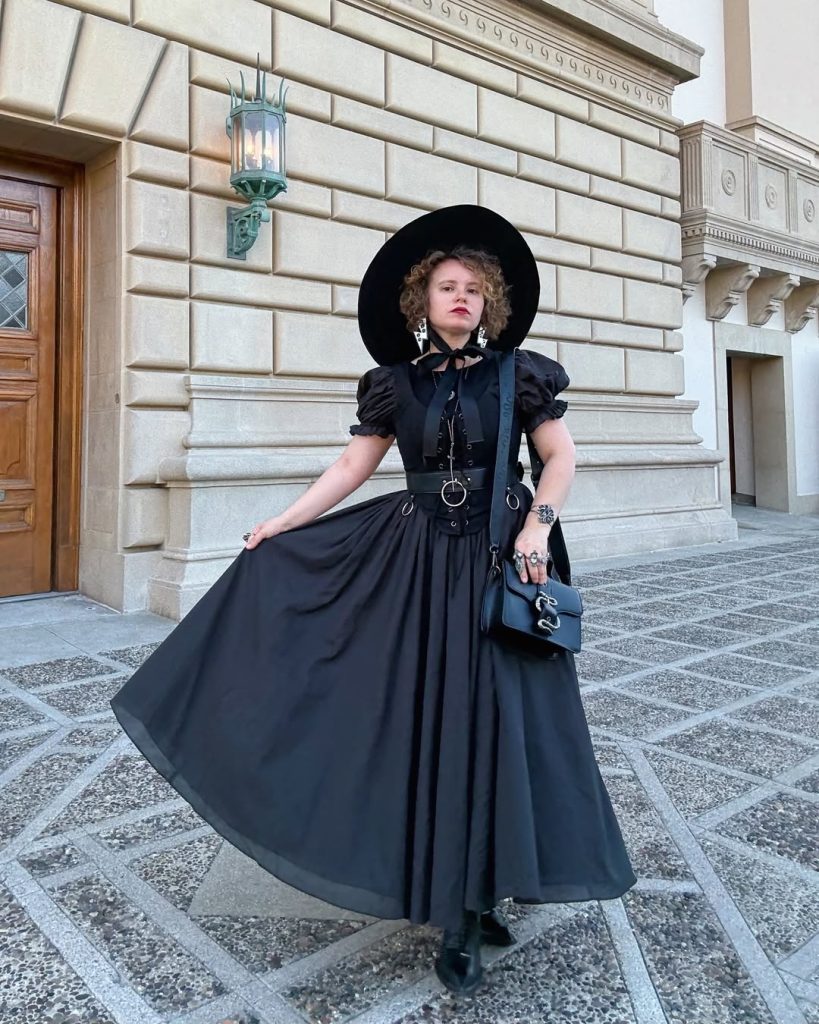 There’s something beautifully powerful about this look—the sweeping skirt, the puffed sleeves, and that dramatic wide-brim hat all create a presence that feels both vintage and modern. It carries a soft bohemian edge with hints of gothic glamour, giving off the kind of energy that instantly turns an ordinary day into a storybook moment. It’s dark, romantic, and effortlessly expressive in the most whimsical way.