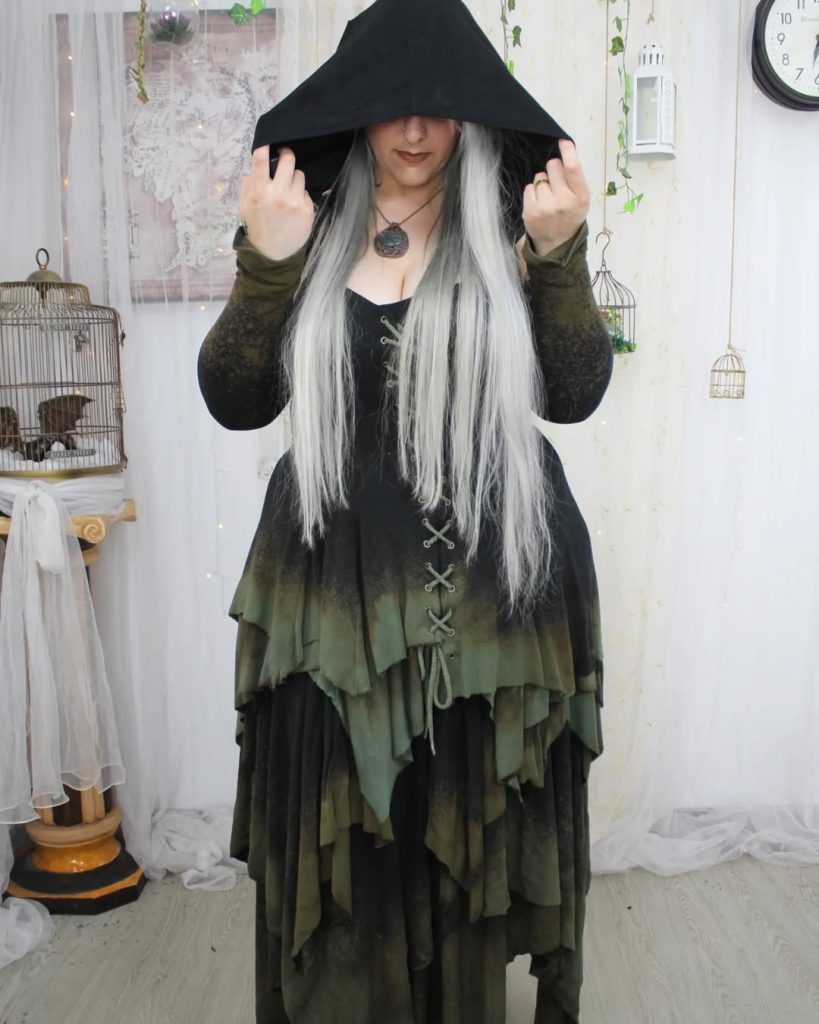 This look feels like stepping straight out of an ancient woodland tale. The layered green and black fabric has a subtle earthy fade that gives the whole outfit a mystical, grounded aura. The hood adds a striking, almost cinematic touch, making the entire look feel deeply tied to nature and old-world inspiration. It’s dark and enchanting but still soft enough to feel approachable.