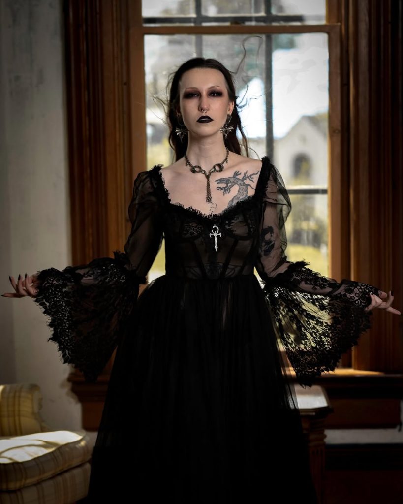 If you’re drawn to outfits with a strong attitude, this one delivers. The lace sleeves create beautiful movement, and the fitted bodice highlights the waist without feeling restrictive. It’s perfect for women who love dramatic fashion moments and want something more elevated than typical Halloween or casual goth looks. Pair it with simple jewelry to let the gown take center stage.