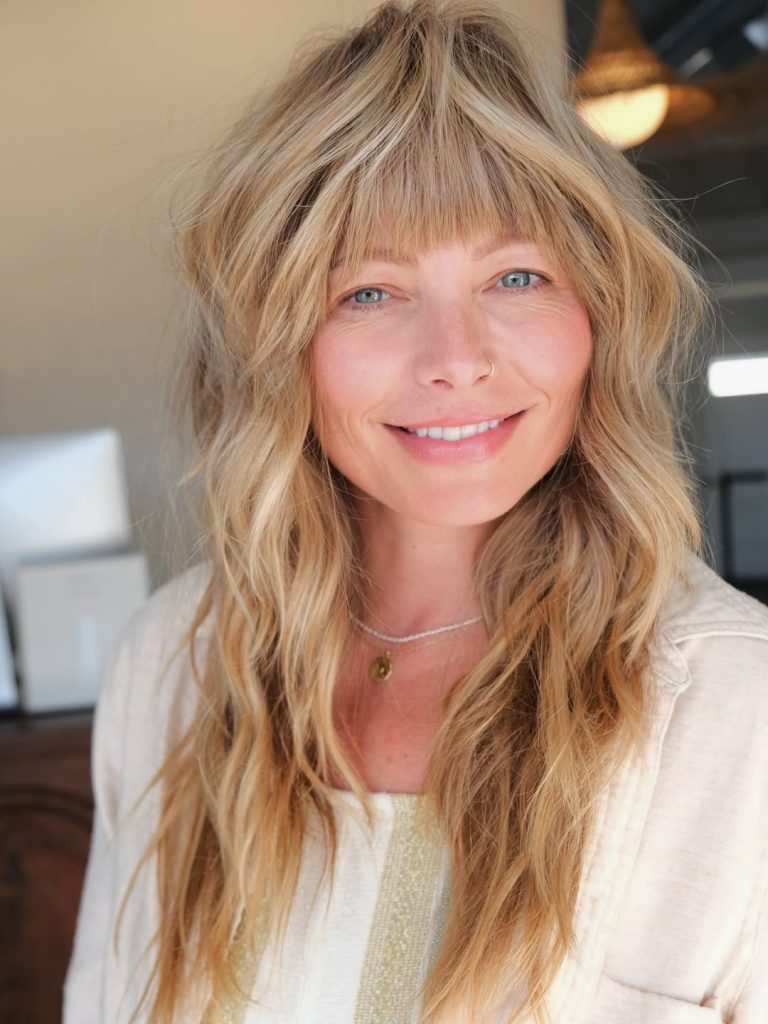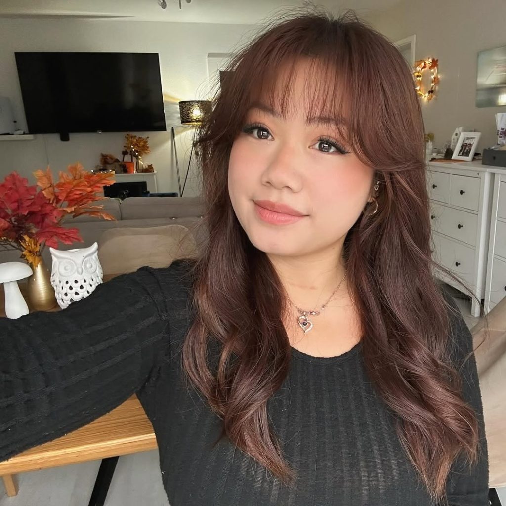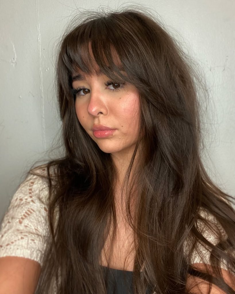 There’s something effortlessly cool about a slightly messy, shag-inspired hairstyle. The layers fall softly around the shoulders, while the wispy bangs create a relaxed, undone feel that looks charming rather than overly styled. The fringe lightly brushes the forehead, giving the face a soft frame that feels youthful and a little artistic.