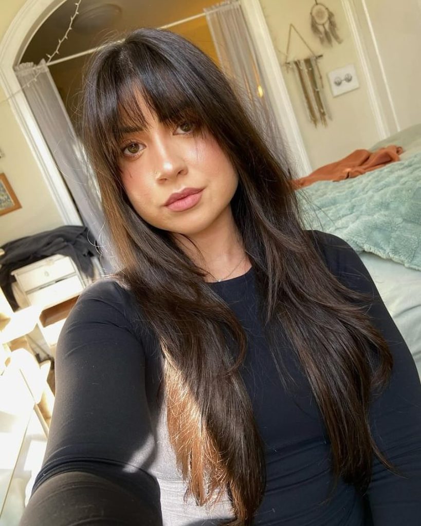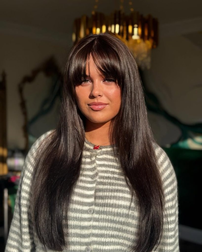 For women exploring the Best types of bangs for a round face, this haircut offers a beautiful balance. The long vertical lines created by the hair visually elongate the face, while the fringe softens the forehead. This Haircut with bangs works beautifully for straight hair and slightly wavy hair, especially when a smoothing serum keeps the texture sleek and shiny.