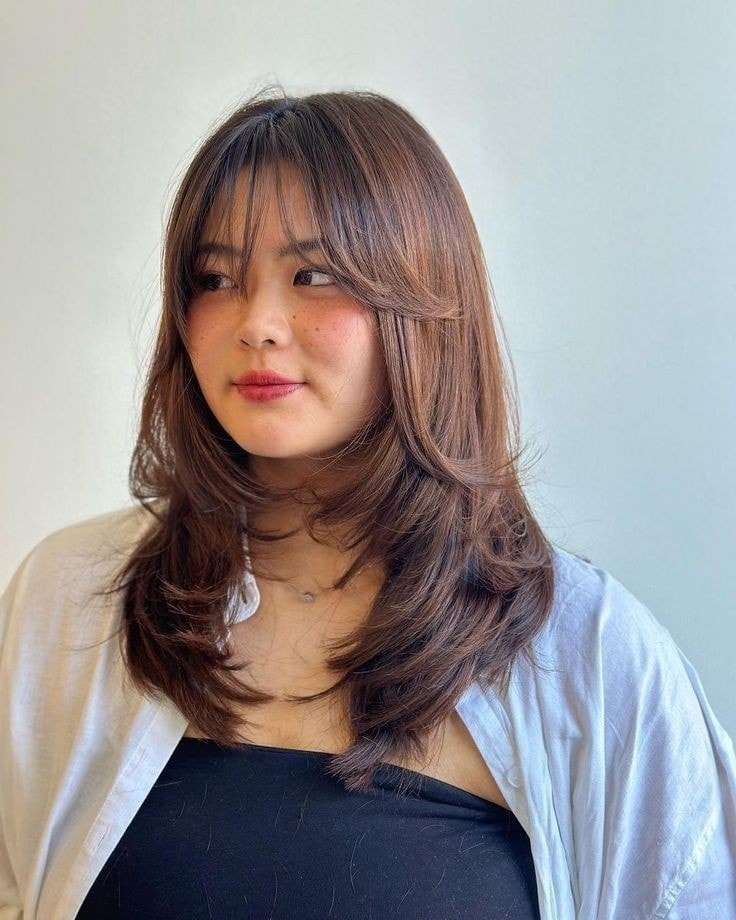 A medium-layered hairstyle with a curtain works wonderfully for women with wavy or straight hair who want movement without sacrificing length. The Face framing layers help soften fuller cheeks, while the fringe adds a flattering vertical effect for round face shapes. A round brush and a touch of styling cream can help shape the curtain fringe, so it falls beautifully on each Side.