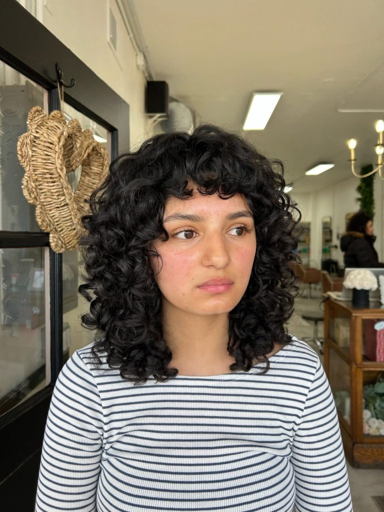 Curly hair with natural bangs has a playful, vibrant personality that’s hard not to love. The curls bounce softly around the face, creating volume and texture that instantly adds life to the hairstyle. Instead of hiding behind straight lines, the curls frame the face in a lively halo, giving the whole look energy and individuality.